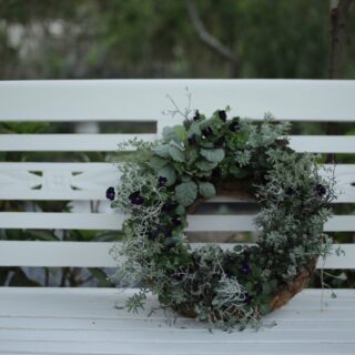 - 告知内容 シックなブラックビオラを主役に、冬の庭を思わせるリースを仕立てましょう。 ※